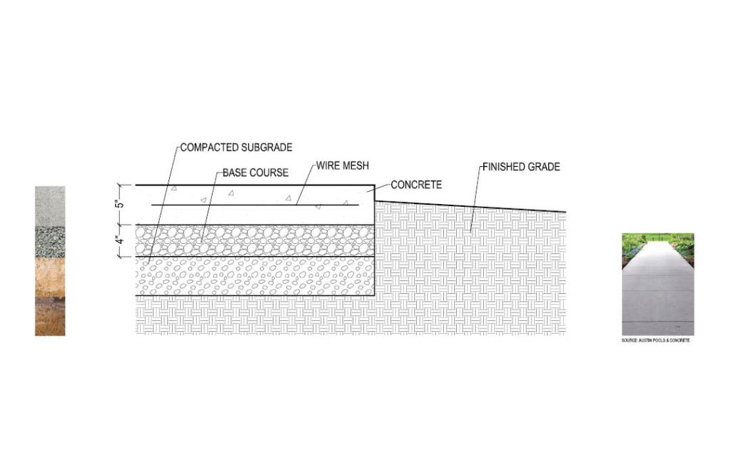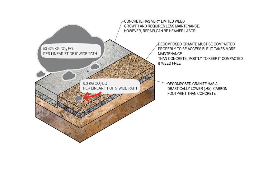 These images compare concrete to decomposed granite as a material for pedestrian paths. While concrete is a ubiquitous and strong material, its production releases significant amounts of CO2 emissions. For this reason, I believe its use in landscape design must be heavily limited. However, concrete is a very effective material at making ADA–accessible paths, which are a necessity so that as many people as possible can access outdoor landscapes. Very fine decomposed granite, or a similarly fine gravel material, is the best alternative for ADA-accessible paths that I have found. However, I expect that it requires further maintenance and upkeep to keep it weed free, though that maintenance requires less strength and materials than removing and repouring a broken concrete slab, for instance. In general, I believe an ecological future requires a shift toward more maintenance which must be performed by equitably-compensated workers or engaged community members.