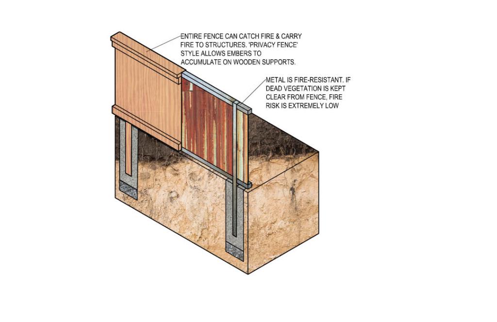 These drawings compare two materials for fences – wood, arguably the most common residential fence material in the US, and steel & reused metal. I’ve been considering fireproof fence materials for several years since wildfires occur frequently in Eastern Washington’s shrub steppe. One such fire years ago was visible from my house, and I’ve realized that even a house that doesn’t directly abut shrub steppe habitat may still be close enough to wildfires to be at risk. Beside metal, fence materials I’ve considered are gabion and cob. Both of these methods take much more work to construct, which is why I’ve depicted metal here. Metal can get very hot in the summer, so using another material such as wood for gate handles is a good idea. I hope this comparison can urge designers and homeowners working in fire-prone areas to explore fire-proof fence materials or at least protect buildings from fire by putting metal flashing between wooden fences and buildings.