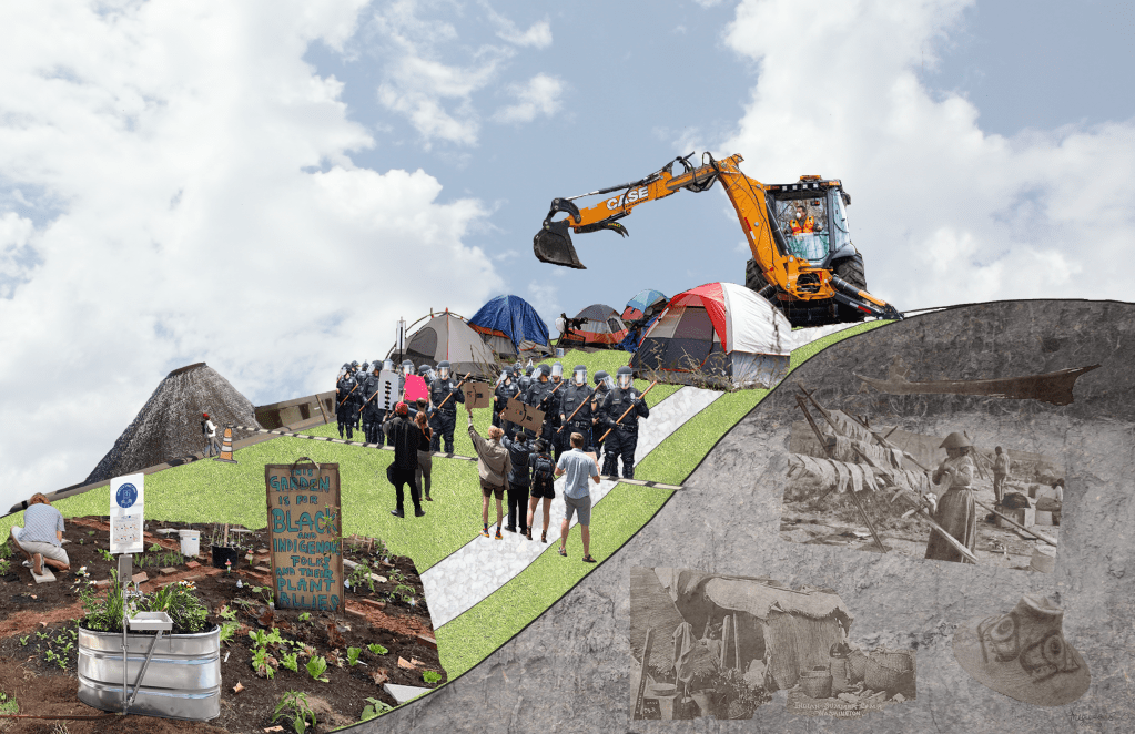 1: A collage featuring a grassy hill. In the foreground is the CHOP garden for Black and Indigenous folks. Beyond are protestors confronting police, who guard demolition equipment used to remove unhoused people’s tents. The inside of the hill is revealed on the right of the image, showing buried Indigenous artifacts and lifeways beneath the earth.