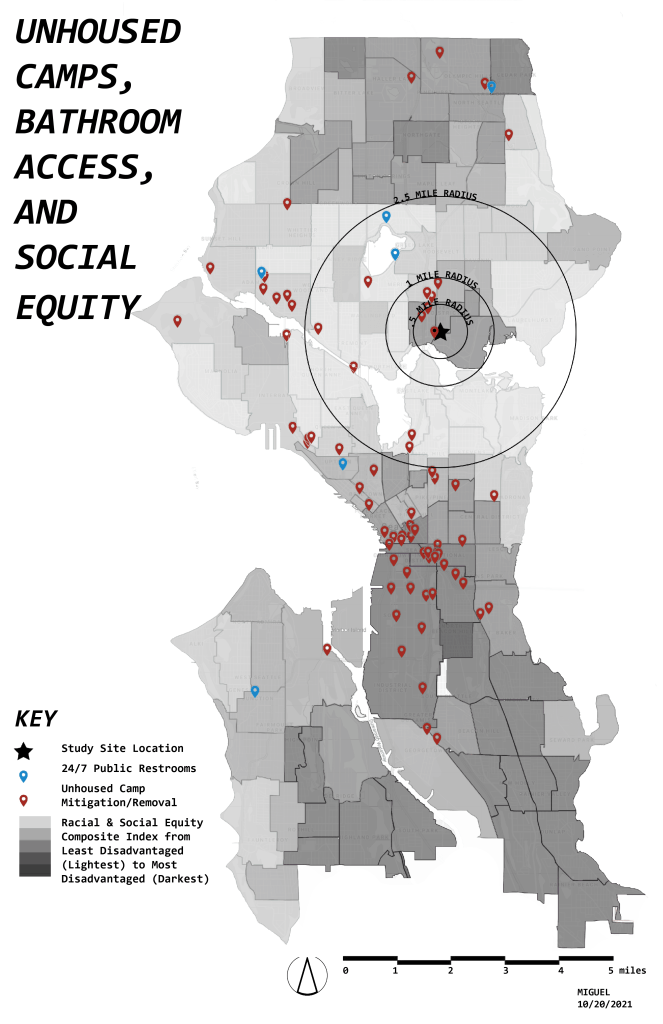 The map draws parallels between homelessness, proximity to hygiene services, and neighborhood wealth by combining the locations of sites where City of Seattle officials performed encampment mitigation and/or removal (in 2020), the locations of the six 24/7 public restrooms in Seattle (2019), and the City of Seattle’s Racial and Social Equity Composite Index (2020). Since many mitigation/removals are performed more than once, these locations may be read as common unhoused encampment sites. This data reveals that encampment sites are clustered in lower-income areas while the resources those encampments need are often concentrated in wealthier areas.