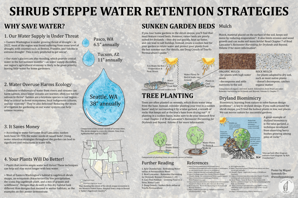 This poster is a resource designed to aid all who manage landscapes in shrub steppe habitats in implementing practices that will reduce water usage, saving money and growing resilient landscapes. Feel free to use this poster for your own (non-commercial) uses, as long as you credit me (Miguel Symonds Orr)!