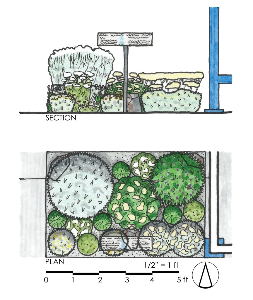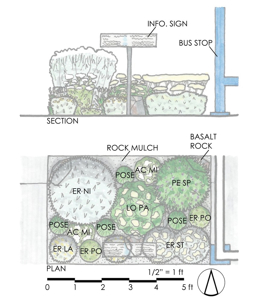 This project is a native plant garden template intended for small urban planting beds on streets or at public spaces such as libraries. The plan drawing depicts a garden in a 4’ by 6’ space next to a bus stop. This design is intended to provide diverse habitat for native pollinators in an urban setting while educating community members about the beauty and value of native plants. It would also reduce watering costs to almost none and provide a low-maintenance space.
