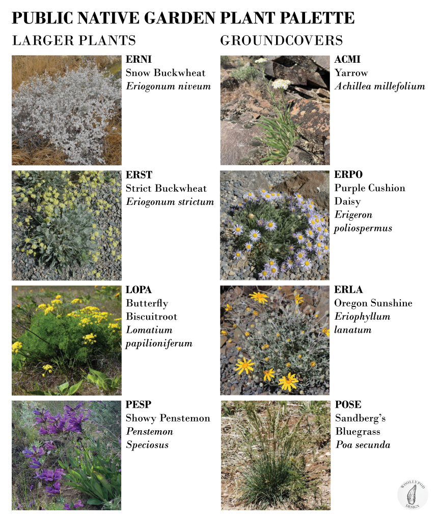 3: A plant palette of the species in the garden. They are: larger plants – Eriogonum niveum, Eriogonum strictum, Lomatium papilioniferum, Penstemon speciosus. Groundcovers – Eriophyllum lanatum, Poa secunda, Achillea millefolium, Erigeron poliospermus.
